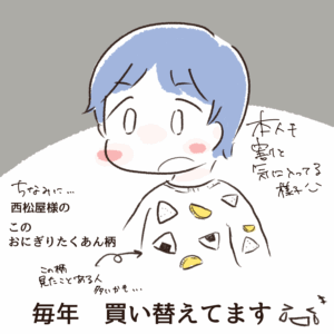 私が「なにこれ〜!たくあんじゃん!!」と一目惚れしてから1歳くらいから毎年サイズアウトしては買い替え続けているこのデザインのトップス。