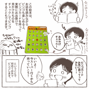 というもので、2回目読んでみるときも1回目とは違うルートを通ってビンゴを埋めてみたりできるし、今回の我が家のように実際にお出掛けに持って行ってもいいし、何度でも楽しめるのでオススメです!