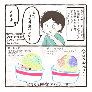 限定ばかり目が行って定番の味をあまり頼まない私ですが、びぃくんはバニラなど私じゃあまり選ばなそうなフレーバーをチョイスするので、新たな発見があってなかなか面白いです。