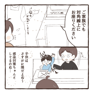 今回はコロナ禍での飲食店に対して対角線に座る、パーテーションを設けるなどの対策が政府から出されてまもなくの頃のお話です。