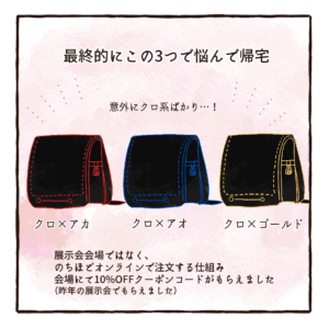 今自分が小学生なら何選んだだろうな〜と一緒に楽しみながら選べたし、専門のスタッフに今のランドセルのあれこれをしっかり聞けたので展示会は本当におすすめです。