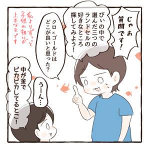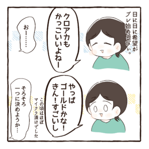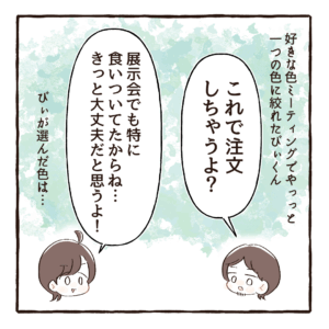 夫がうまく『こっちとこっちだったらどっちだろう?』などと質問してくれて、ちゃんとびぃくんの選んだ好きな色を注文することができました。