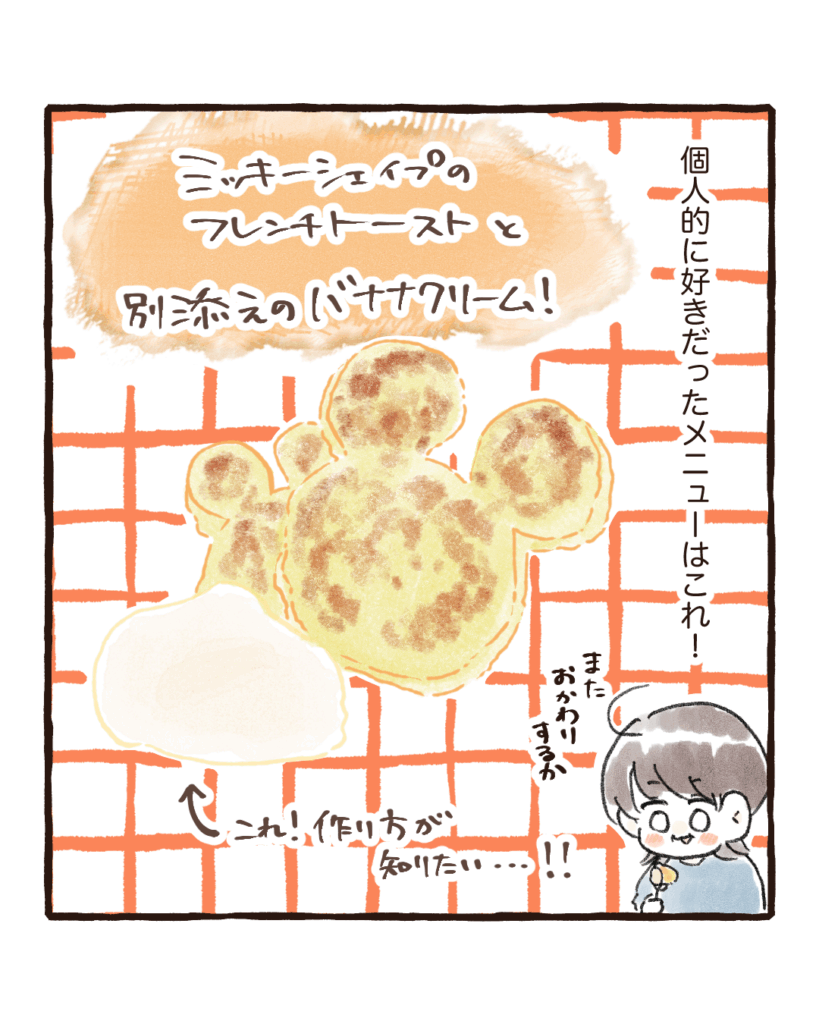 ミッキーシェイプの食べ物やお子様にはミッキー達のランチョンマットも用意されていて気分が上がる!