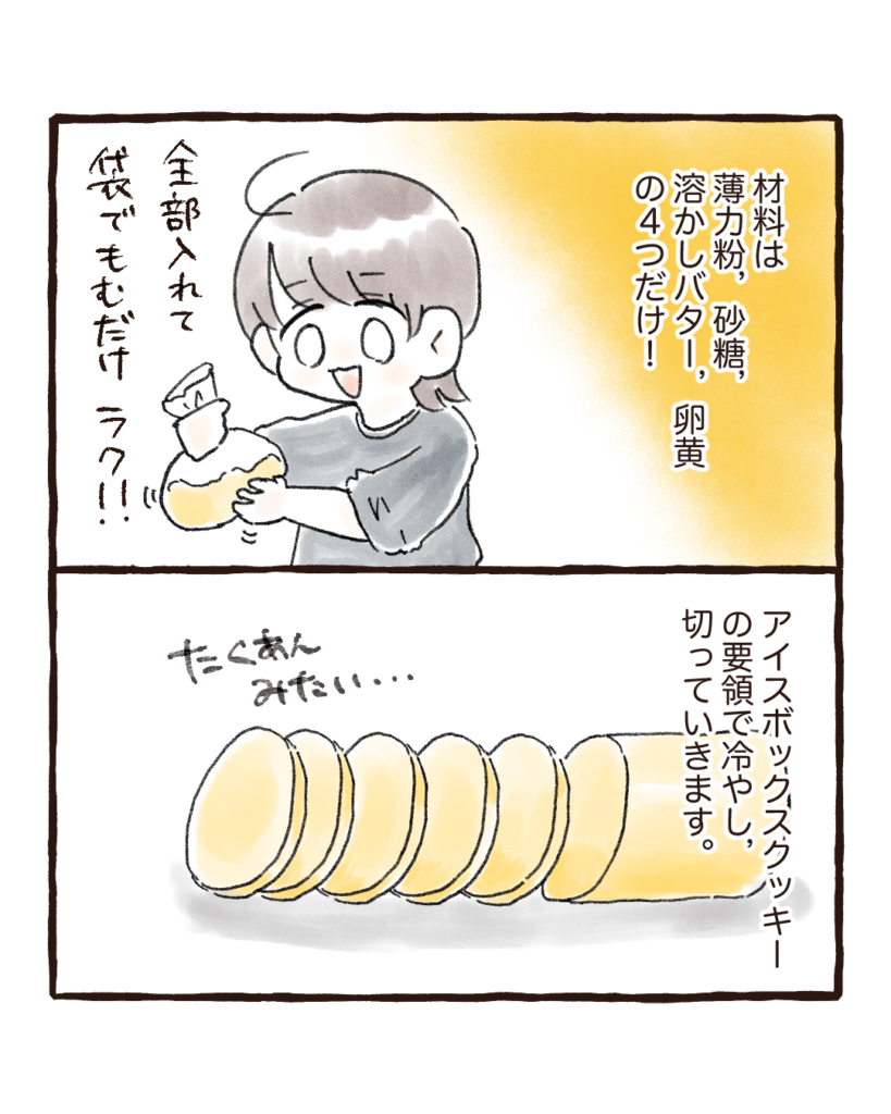 アイスボックスクッキーのように生地を冷やしてから切るので、休日にゆったり作って午後のおやつにもちょうど良い!